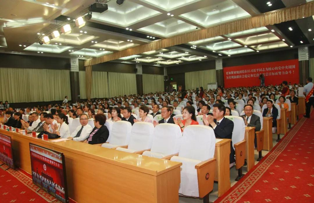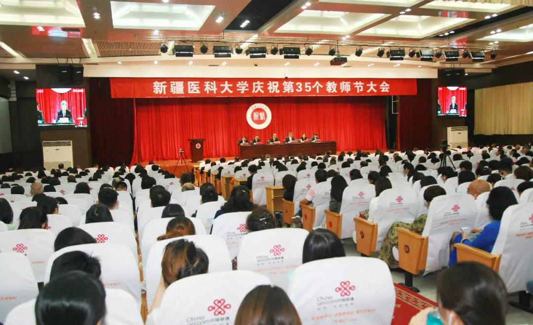 庆祝大会以视频会议的形式召开,在家的校领导、各临床医学院(附属医院)党委书记、院长,各职能处室、各学院副处级及以上干部、非隶属附属医院教师代表、全体教师、学生代表在校本部主会场参加了大会。各临床医学院、一附院昌吉分院、哈密市中心医院、墨玉县人民医院、墨玉县“访惠聚”驻村工作队前方党工委、克拉玛依学院、高职学院(巴州校区)12个分会场共3000多人参加了庆祝大会。