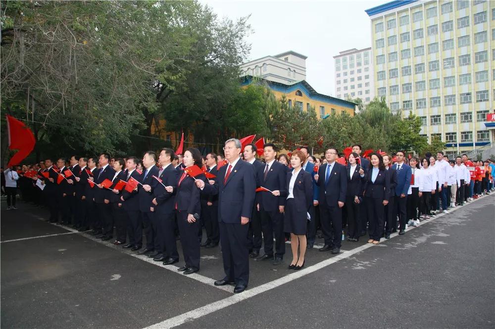 全体在家校领导、全体正处级以上干部、校本部和鲤鱼山校区副处级干部、各党支部书记,教师代表、各学院政治辅导员、班主任代表,本专科学生、研究生代表等在校本部参加了升旗仪式。