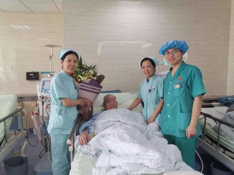 此时,老人才恍然大悟,“原来是我91岁生日到了呀!没想到我这个年龄的老头儿还能收到鲜花,感谢透析室医护人员记得我的生日,感谢你们对我的精心照顾。”老人激动万分。