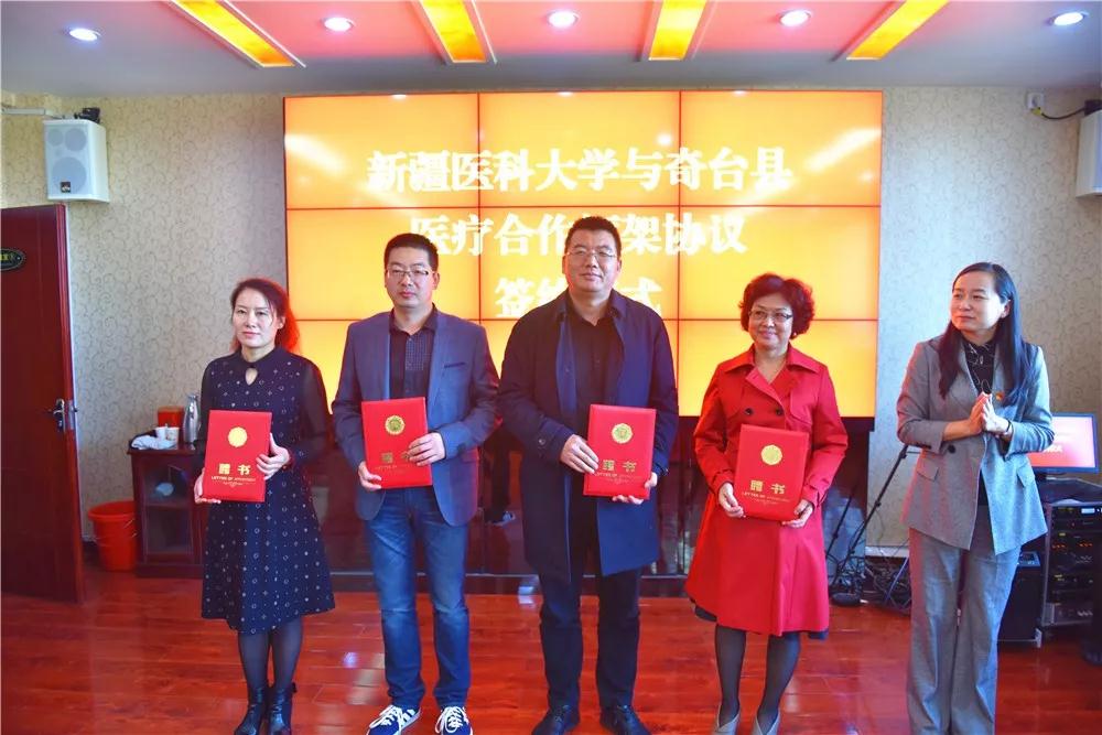 奇台县委书记马旭东主持会议,医院管理处王戈处长与奇台县县长张峰签订了《beat365唯一官方网站与奇台县人民政府加强医疗合作的框架协议》和“人才柔性引进协议”,奇台县人民医院聘请第一附属医院心理医学中心伊琦忠主任为名誉院长,奇台县中医医院聘请附属中医医院泌尿科主任医师马超为名誉院长,聘请10名专家为名誉科室主任,并举行了“师带徒”拜师仪式。巴楚县人民医院名誉院长、附属肿瘤医院胸外科副主任阿迪力·萨来在会上分享了巴楚县人民医院管理经验。