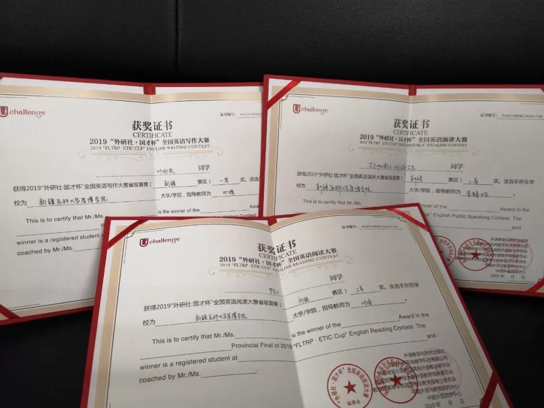 10月19日至20日,2019“外研社·国才杯”全国英语演讲、阅读、写作大赛--新疆赛区决赛在石河子大学举行,全疆共37所高等院校参加。克拉玛依学院临床医学2018-04班学生叶刚成获写作大赛一等奖卫生检验与检疫2018-01班学生艾尔帕提江·阿布都艾尼获演讲大赛二等奖护理学2018-02班学生罗吉云获阅读大赛三等奖英语学教研室叶婧老师、李静娅老师获“优秀指导教师”称号