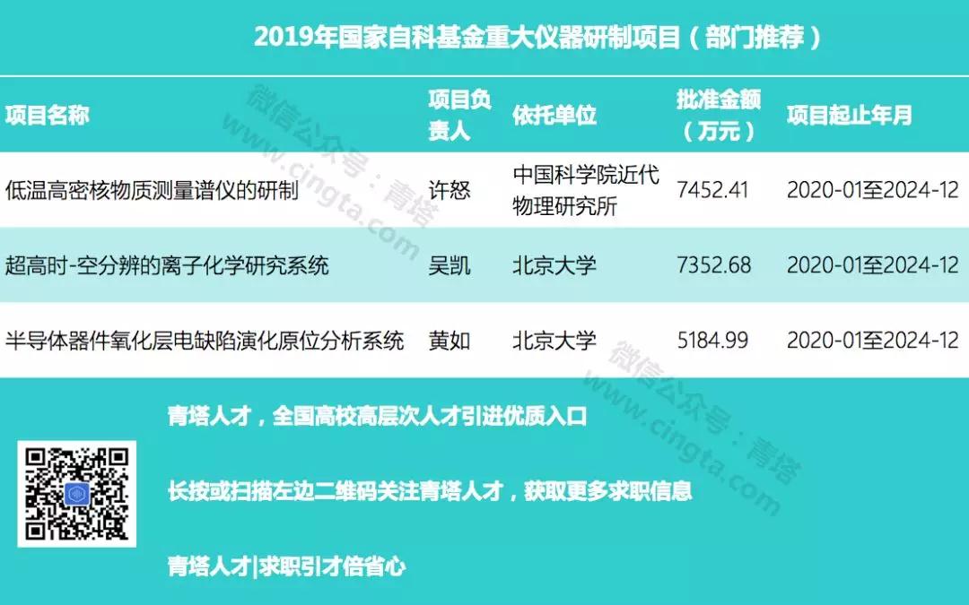 本次公布的为金额更大的国家重大科研仪器研制项目(部门推荐)项目,今年仅有3项获批,单个项目经费都在5000万元以上。北京大学共有2项获批,中国科学院近代物理研究所有1项获批。