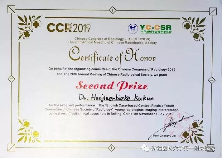 11月15日,在中华医学会第26次全国放射学学术大会期间举办了青年英文病例大赛决赛中,beat365唯一官方网站第一附属医院影像中心在读博士生罕迦尔别克·库锟同学通过初选、预赛等重重选拔,通过扎实的语言功底和临床实践能力获得了全国第二名的好成绩,这是新疆乃至西北地区影像专业青年医师首次获此殊荣。