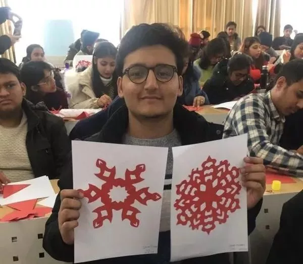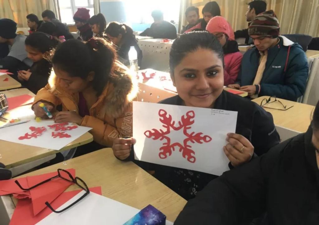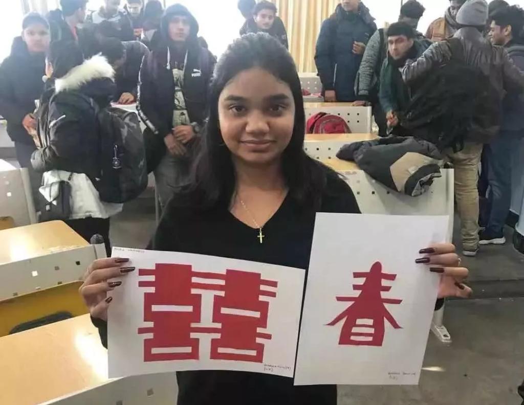 初次来到中国的印度留学生约瑟夫·威廉姆·维罗妮卡·茹斯,以前从没有接触过中国的文字。心灵手巧的她,出于对中国汉字的热爱,剪出了“春”和“喜”两个字,她骄傲地给老师展示自己的作品。