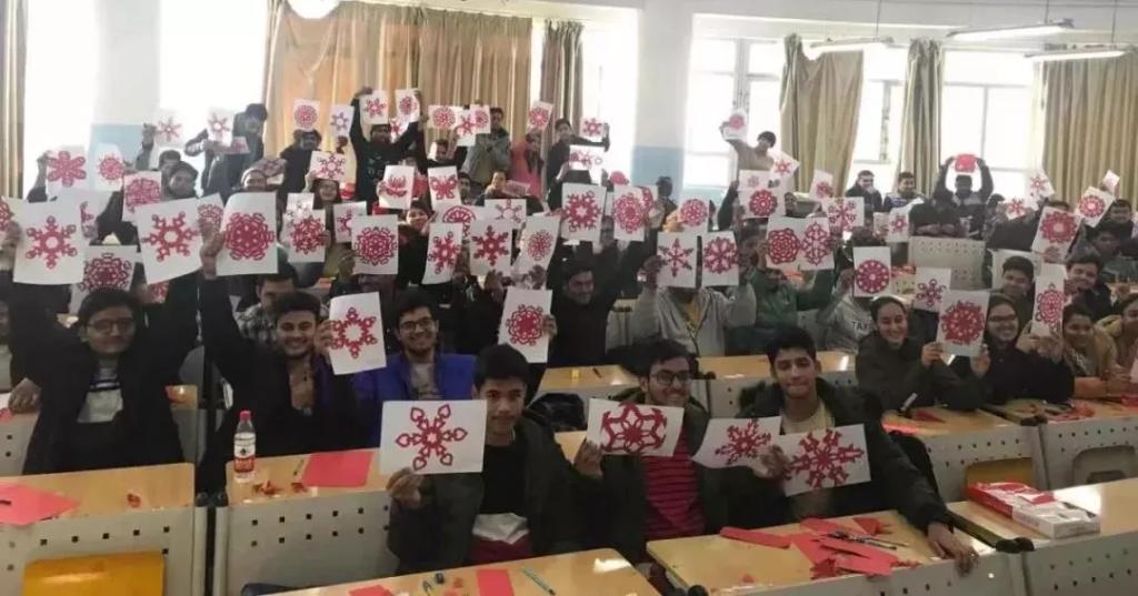 留学生们对中国剪纸的首次“触电”感到无比兴奋大家都高高举起自己的作品用汉语大声说着“新年快乐”!