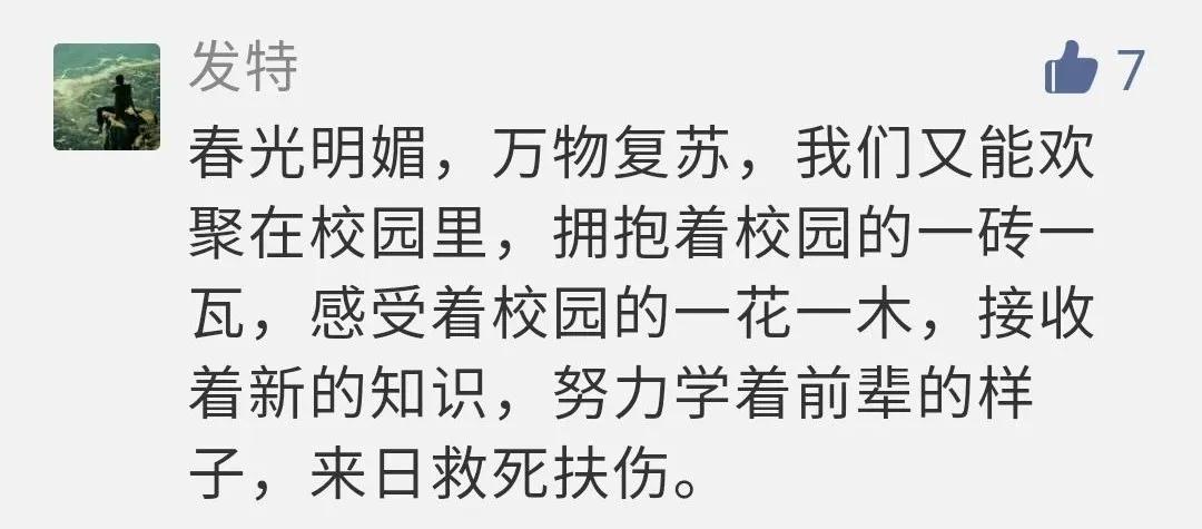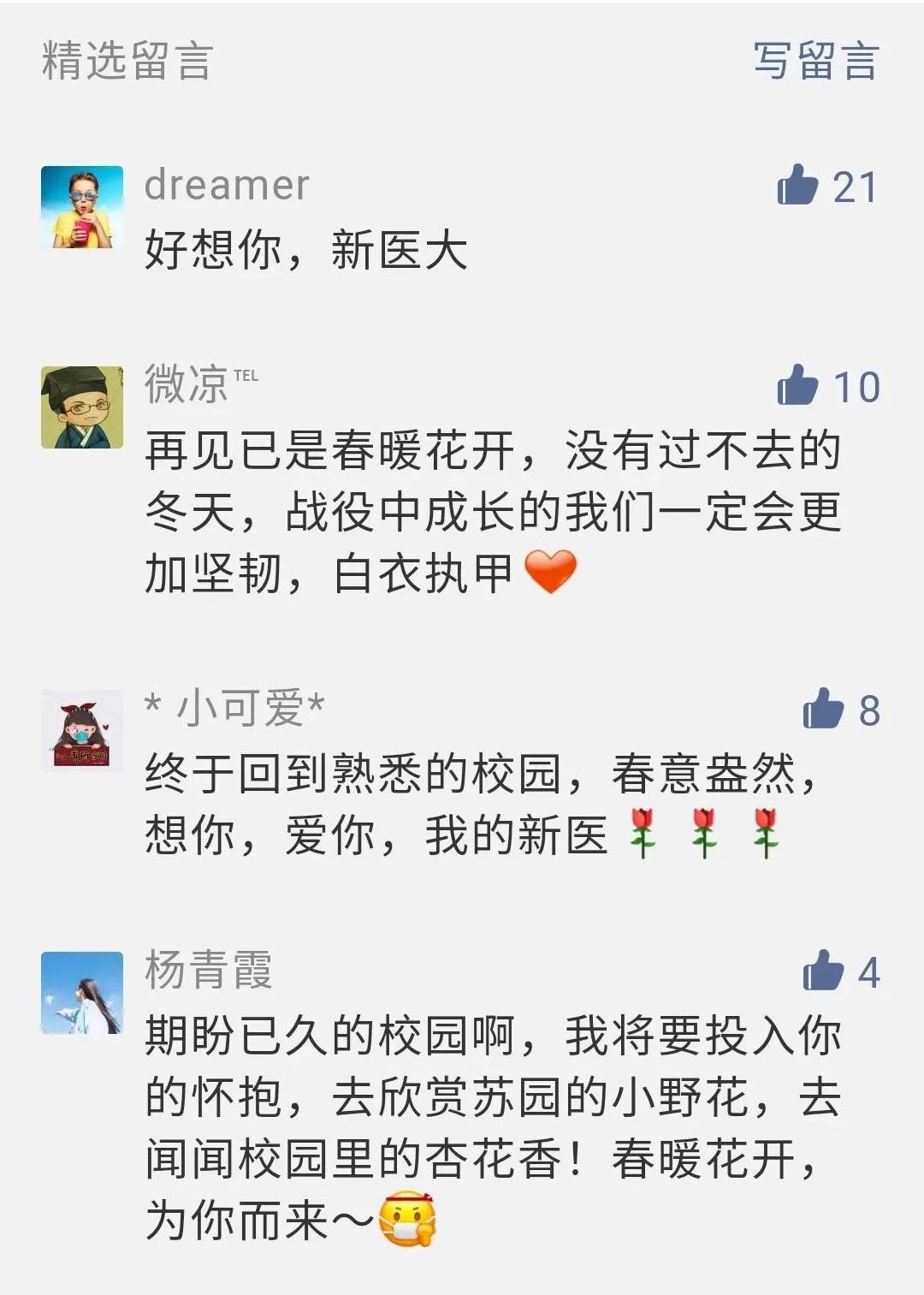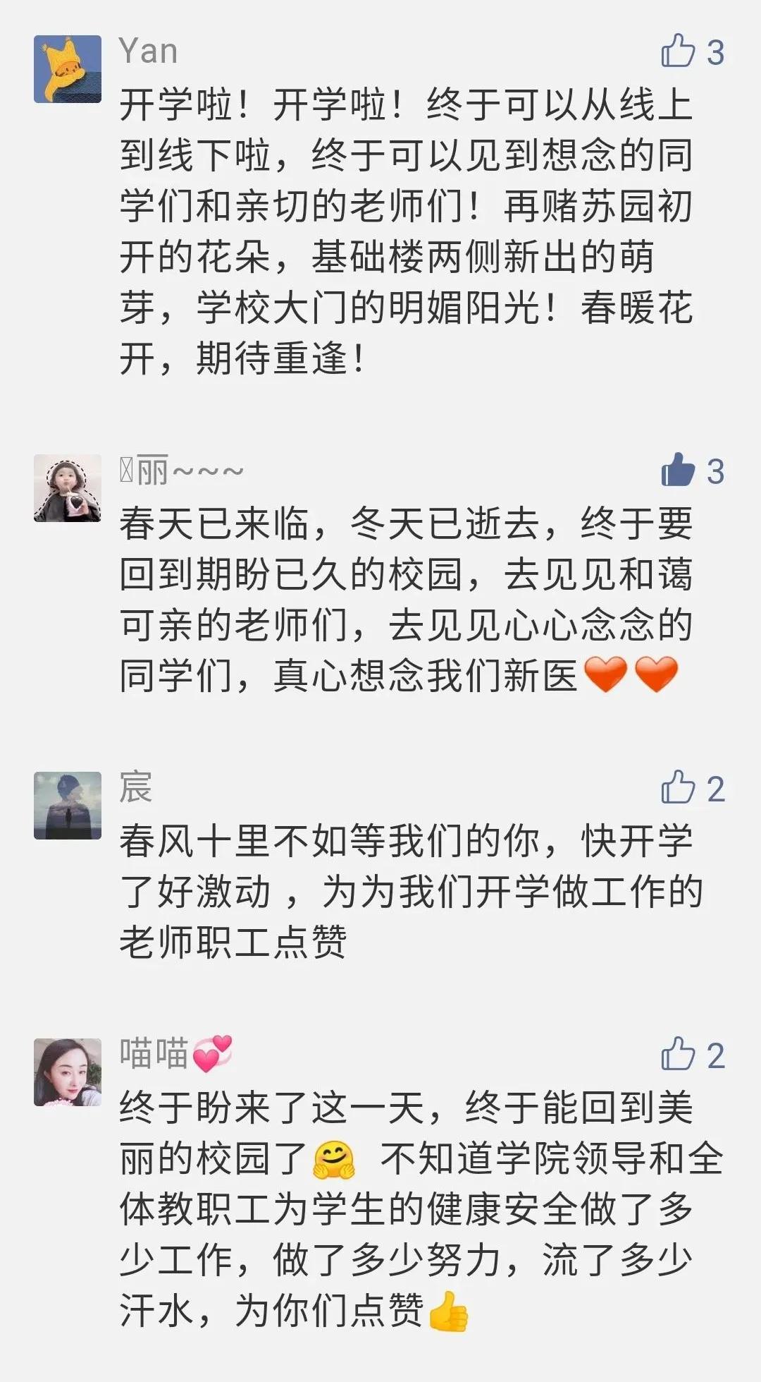 在留言区,新医的同学们纷纷发表感想,诉说着想念学校、想念师长和同学的心情,可谓归心似箭!同学们也对为了准备这次开学复课做了大量工作的教职工们表达了感谢之情。