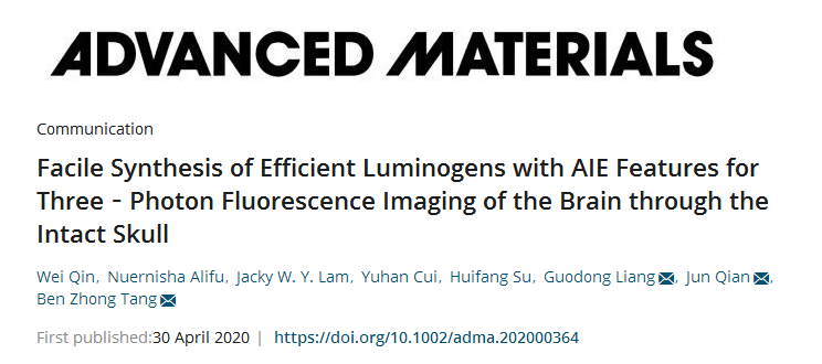 5月1日,国际权威学术期刊《Advanced Materials(AM)》杂志发表了beat365医学工程技术学院努尔尼沙·阿力甫博士联合香港科技大学唐本忠院士、中山大学梁国栋副教授和浙江大学钱骏教授的最新合作成果——首创AIE点无创3PF显微成像技术,实现活体脑卒中过程可视化。论文题目为“Facile Synthesis of Efficient Luminogens with AIE Featuresfor Three‐Photon Fluorescence Imaging of the Brain through the Intact Skull”。努尔尼沙·阿力甫博士为并列第一作者。《Advanced Materials(AM)》为国际权威TOP期刊,其2018年的影响因子为28.809。