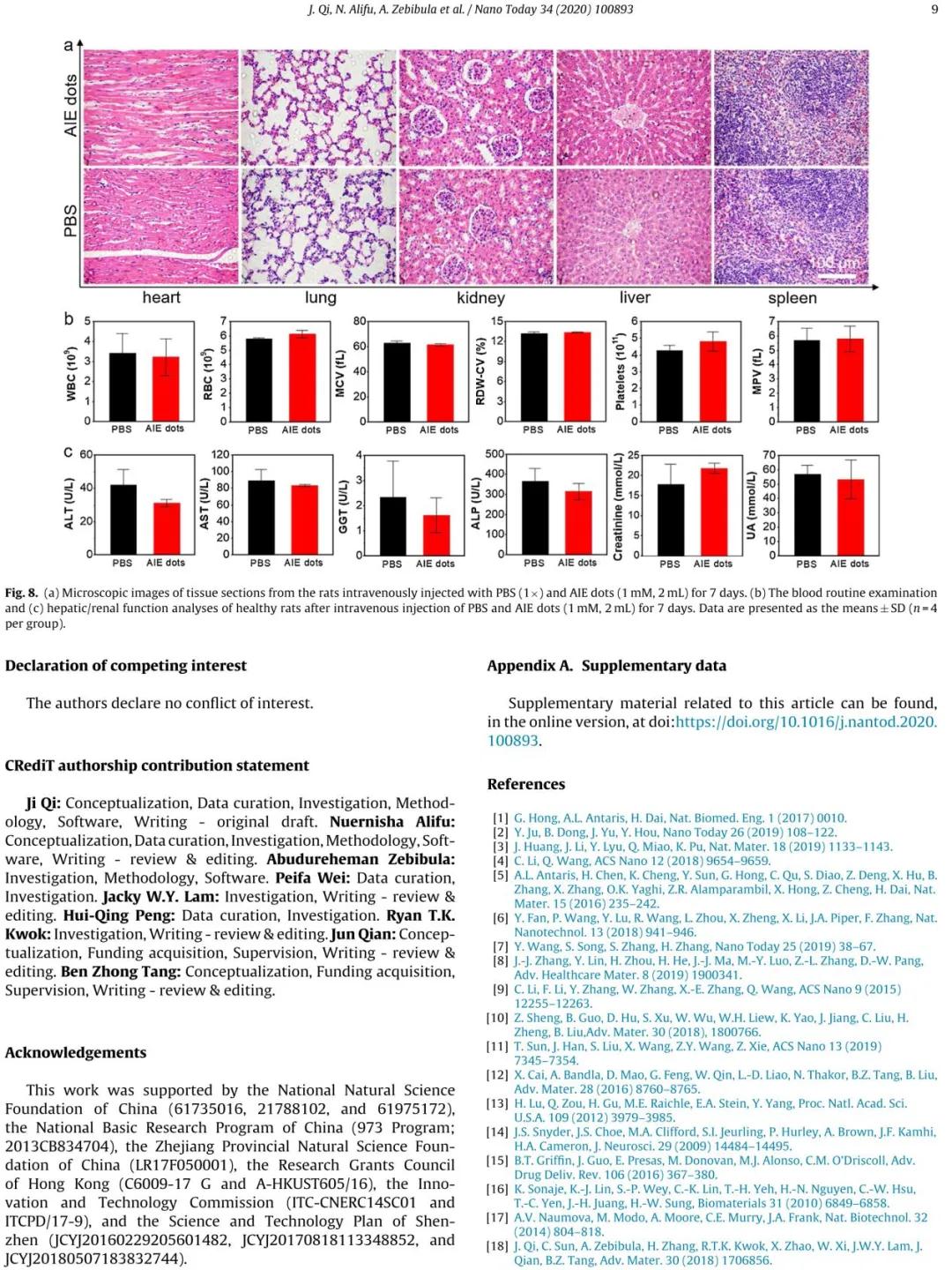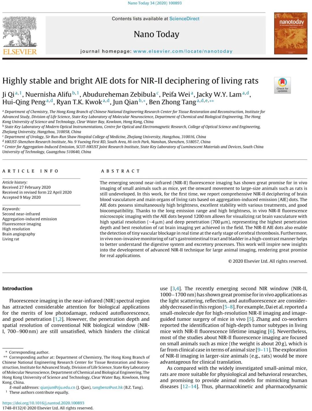 6月14日,努尔尼沙·阿力甫博士与浙江大学钱骏教授研究团队及香港科技大学唐本忠院士研究团队、香港科技大学及哈佛大学医学院齐迹博士合作,作为为共同第一作者,在期刊《Nano Today》上发表了题目为《Highly stable and bright AIE dots for NIR-II deciphering of living rats》的研究报道。该论文利用在近红外二区(near-infrared II, NIR-II)发射荧光的聚集诱导发光(Aggregation-induced Emission, AIE)纳米探针实现了活体大鼠主要器官实时显影和可视化的脑卒中成像。《Nano Today》为国际材料科学领域JCR一区Top期刊,2020年的最新影响因子IF=16.907。