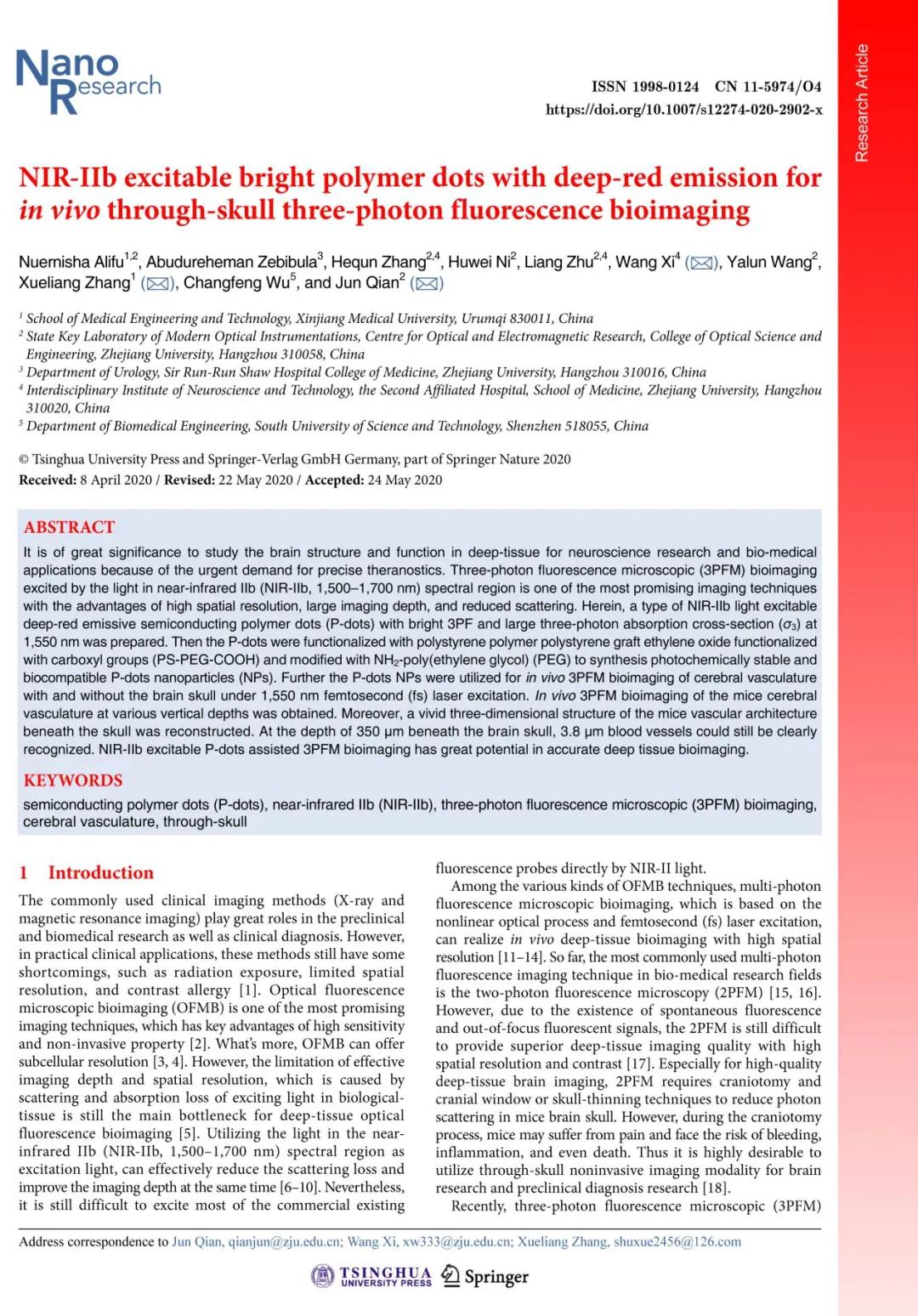 7月1日,在庆祝建党99周年之际,beat365努尔尼沙·阿力甫博士和浙江大学钱骏教授研究团队合作,以第一作者身份在期刊《Nano Research》上发表了题目为《NIR-IIb excitable bright polymer dots with deep-red emission for in vivo through-skull three-photon fluorescence bioimaging》的研究报道(https://doi.org/10.1007/s12274-020-2902-x)。该论文利用基于近红外二b区(near-infrared IIb, NIR-IIb,1500-1700 nm)光作为激发光的三光子荧光显微成像技术,以聚合物纳米粒子(Polymer Dots, P-dots)作为荧光纳米探针实现了活体小鼠穿颅及开颅下的脑血管高分辨率实时显影。这些良好的结果有望为开发用于活体脑的无创生物成像、具有强非线性光学效应的高效发射体开辟一个新的途径。《Nano Research》为JCR一区Top期刊,2020年的最新影响因子IF=8.183。