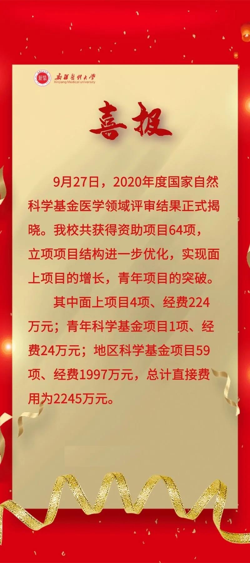 beat365唯一官方网站和各个附属医院在基金申报过程中,加强创新引领和学科交叉,整合二级学院与附属医院的优势资源,强强联合,组建研究团队,扩大基金申报的学科覆盖面。2020年学校在国家自然科学基金各学部均有项目斩获,其中生命科学部4项(经费182万元)、管理科学部3项(经费85万元)、信息科学部1项(经费35万元)和医学科学部55项(经费1909万元)。