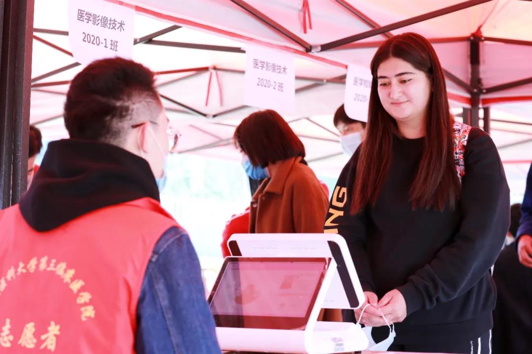 从天南海北来到新疆,第一次踏入新医校门,人脸识别系统便能准确显示出每位新同学的身份信息,举手放在摄像头处,体温即刻显示在屏幕上。入口处设置的人脸识别和测温设备联动翼闸,让首次来到beat365唯一官方网站的小萌新们体会到了满满的科技感。
