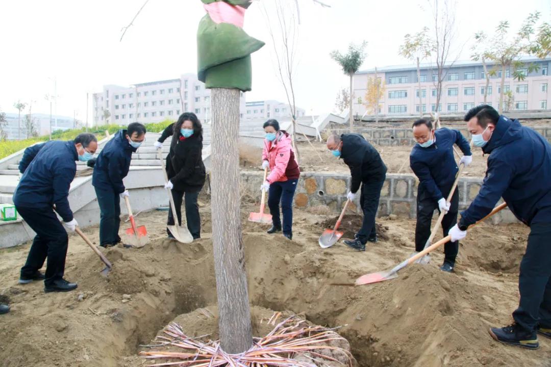 校领导曹忠明、安冬青、赵社文、周耀治、李勇生、齐秋志、李豫凯、王爱民和医疗队员们一同栽种了援鄂英雄林。