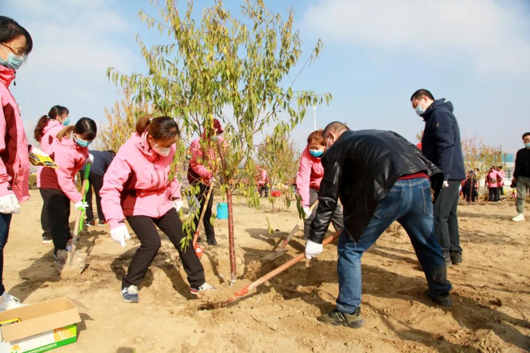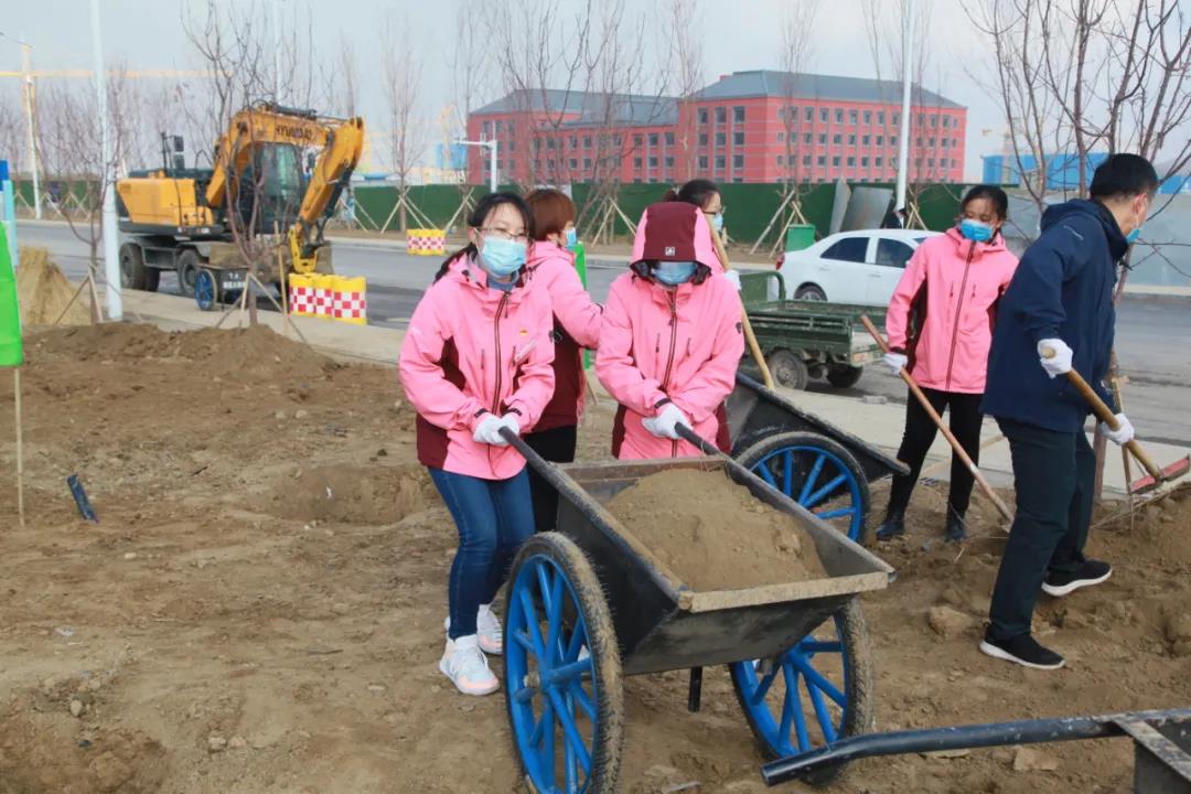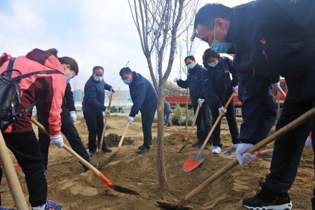 大家拿起铁锹,你一锹我一铲相互协作,挖树坑、放树苗,培土、修埂、浇水,远山广场上到处是热火朝天的忙碌景象。