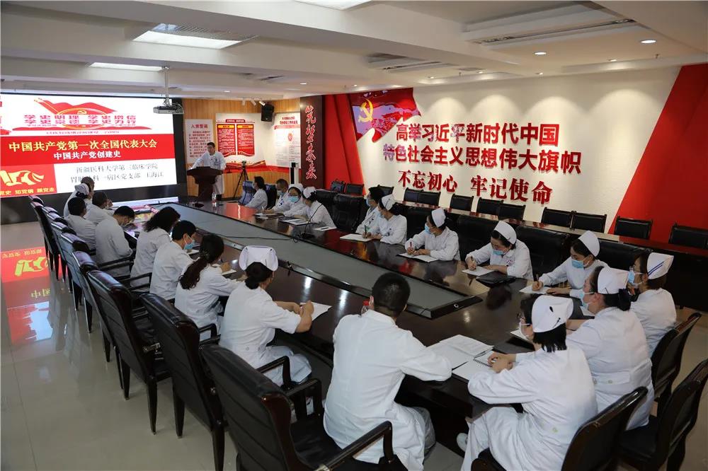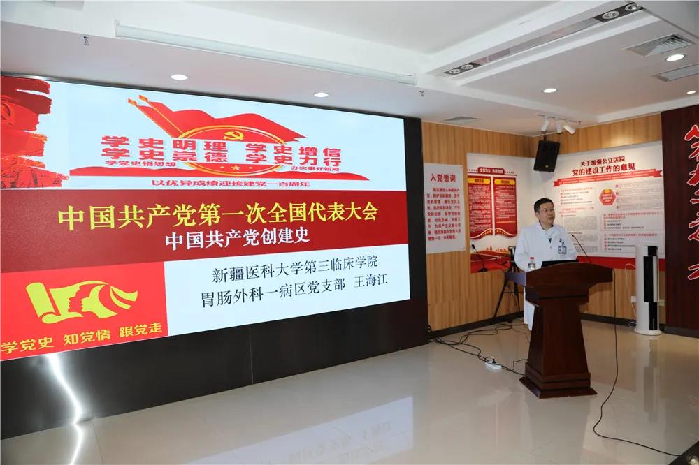 在胸外科一病区党支部联合肺内科(二病区)党支部开展的主题党日活动上,王海江以“红船精神”为题,带领大家回顾了中国共产党成立的艰辛历史,对中国共产党“一大”的召开和“一大”党代表的人生轨迹进行生动讲解和展现。