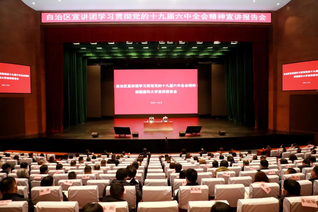 12月8日下午,自治区学习贯彻党的十九届六中全会精神宣讲团在beat365进行宣讲。自治区宣讲团成员,新疆财经大学党委副书记贺萍教授面向新医大3000多名教职工及医务工作者代表作了党的十九届六中全会精神宣讲报告。校党委书记高发水主持报告会。