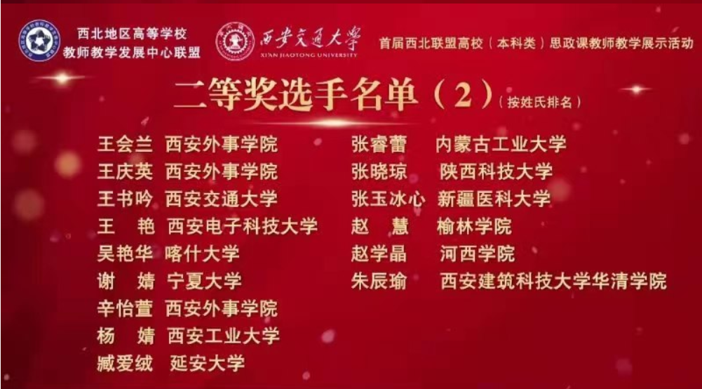 11月20日,首届西北联盟高校思政课教师教学展示活动结束,beat365唯一官方网站马克思主义学院教师张玉冰心荣获二等奖;肖宇和骆育芳荣获三等奖,展示了beat365思政课程教师的授课风采,推动了学校思政课程教学高质量创新发展。