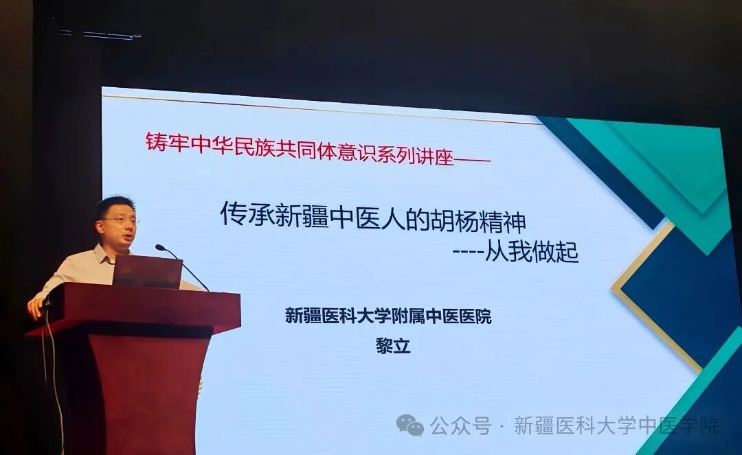 在热烈的掌声中,黎立医生以《传承新疆中医人的胡杨精神——从我做起》为题,他以自身经历诠释了何谓“胡杨精神”——就像深深扎根于荒漠的胡杨,耐得住风沙,守得住生命,在艰难环境中依然昂首挺立、默默守护。黎医生将这种精神融入那场牵动人心的生命接力中:1400公里的跨越,是各族群众心手相连铺就的生命通道;机场、机组、乘客、交警——素昧平生却同心协力,为男孩争取每一秒生机;手术室中的分秒必争,是医者以专业与坚持让断臂重获生机。胡杨不语,却见证着生命的坚韧;医者仁心,也在这样的接力中得以升华。