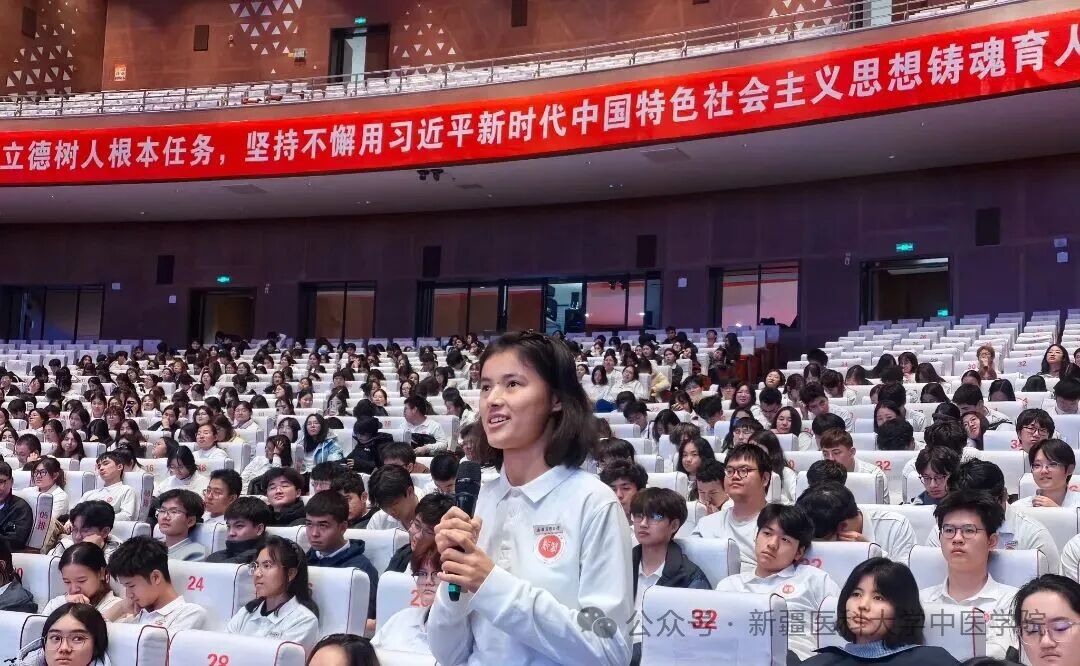 在互动环节,中医学(全科)2025-1班巴哈尔古丽·阿布都吉力力同学踊跃提问:“您的故事让我深刻感受到中华民族血脉相连的力量。我特别注意到您在南疆建立名医工作室的经历。作为中医学生,我想请教:我们中华民族的共同瑰宝——中医药,能在促进民族团结中发挥哪些独特作用?”黎立医生从中医文化、“一带一路”中医药的作用展开回答,现场气氛温馨而热烈。