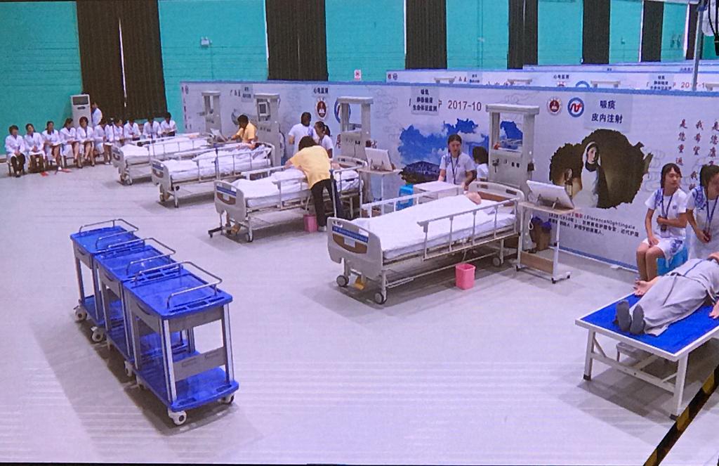 本次大赛由全国高等医学教育学会护理教育分会主办,以“融合,发展,卓越”为主题,实行赛道式团体赛,以团体总分排列名次。各参赛队的三名选手在临床案例构设的虚拟病房情境中,必须于20分钟内,合作完成案例分析,提出护理问题和护理措施,并结合医嘱迅速、准确地实施相关操作,其项目涵盖吸氧、静脉输液、心肺复苏、心电监测、皮试、肌肉注射、生命体征检测、鼻饲、吸痰等9项临床技能,要注重无菌操作原则、职业防护、以及沟通交流与人文关怀。