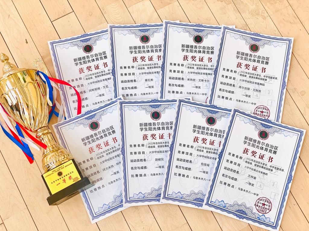 2022年自治区大学生、中学生健美操、啦啦操和健康街舞校园联赛中,beat365唯一官方网站代表队在“大学甲组规定有氧舞蹈”竞赛项目中,喜获一等奖。