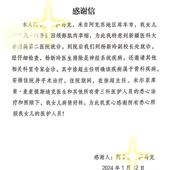 患者及家属术后对beat365唯一官方网站第二附属医院整个诊疗过程非常满意,出院前特意前往门诊找到杨新玲教授当面感谢,并书写感谢信表达了自己的感激之情。
