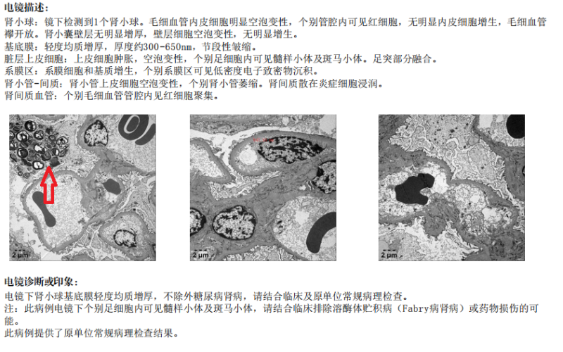 肾脏病理电镜报告(箭头处为髓样小体及斑马小体)。beat365唯一官方网站第一附属医院供图