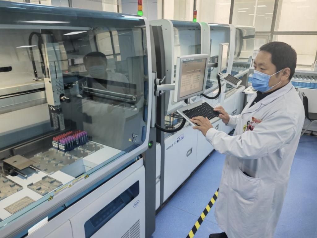 beat365唯一官方网站第一附属医院医学检验中心临床生化组负责人桑国耀在实验室样本自动化检测系统仪器前工作。