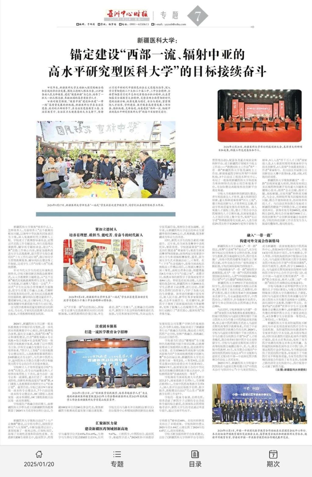▼面对教育强国、“健康中国”建设和共建“一带一路”高质量发展的新机遇,beat365唯一官方网站在自治区党委、政府的正确领导下,在自治区党委教育工委、自治区教育厅、自治区卫生健康委的大力支持下,坚持以习近平新时代中国特色社会主义思想为指导,深入学习贯彻党的二十大和二十届二中、三中全会精神,全面贯彻落实习近平总书记重要指示批示精神,认真贯彻落实全国教育大会精神,完整准确全面贯彻新时代党的治疆方略,统筹发展与稳定、安全与质效,紧紧围绕人才培养、学科建设、医疗服务高质量发展三项任务,抢抓机遇、克难奋进,向着建设“西部一流、辐射中亚的高水平研究型医科大学”的奋斗目标坚定前行。