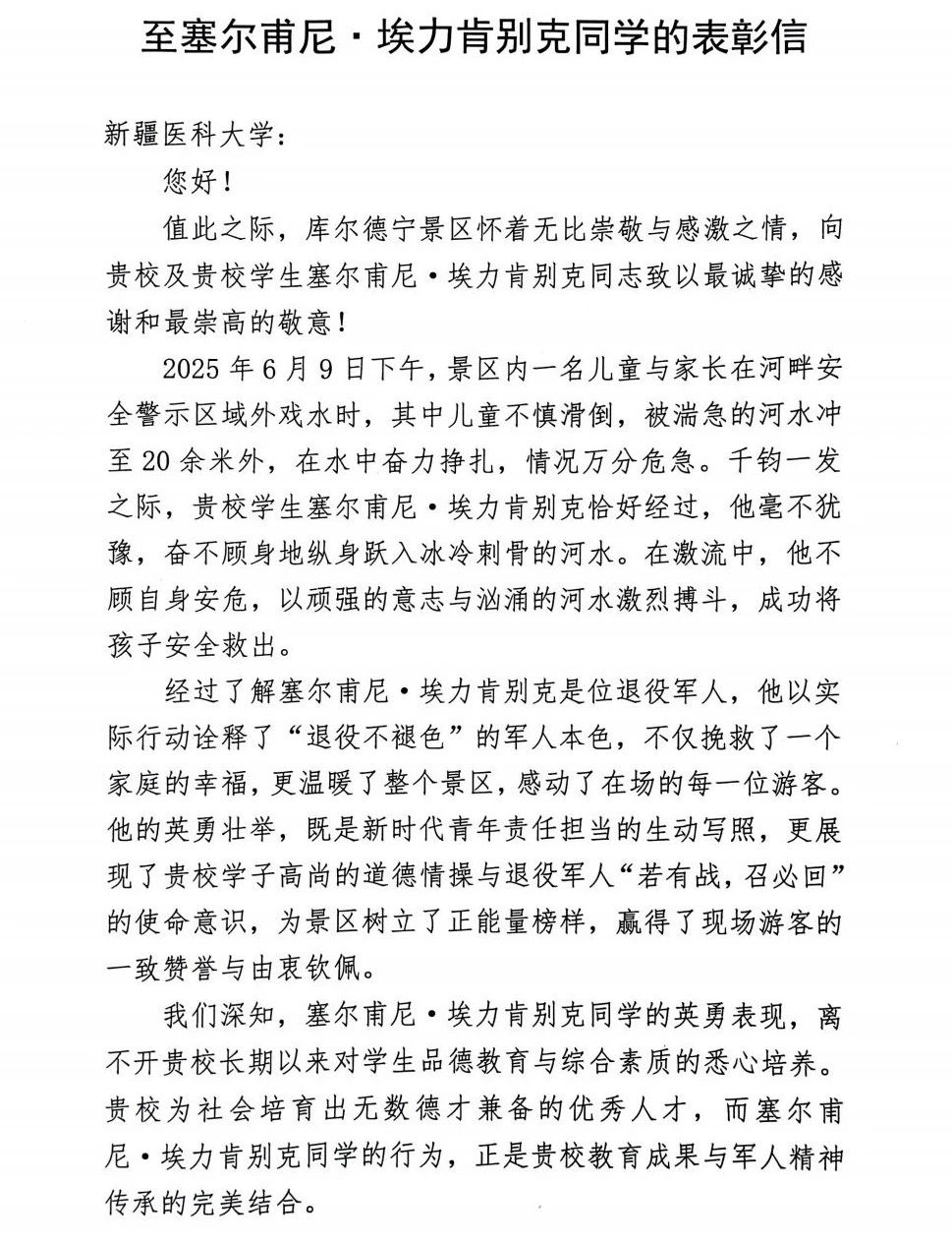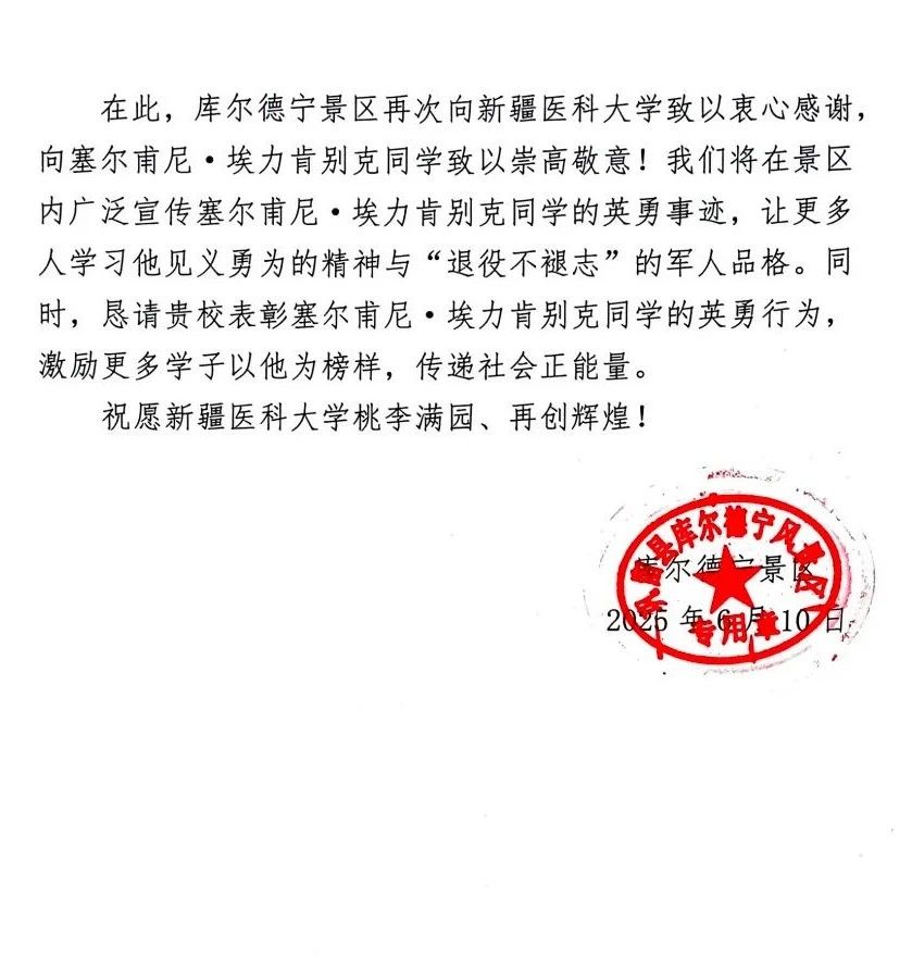 塞尔甫尼・埃力肯别克的行为得到了景区管理部门的高度赞扬,景区特地向beat365全科医学学院发来了感谢信,对塞尔甫尼・埃力肯别克的英勇事迹表示肯定与感谢。同时,在现场游客中也引起了强烈反响,大家纷纷为他的英勇之举点赞。