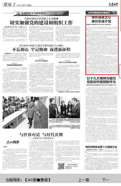 作为一名少数民族党员干部,我见证了党对新疆各族群众的关爱,所以,我们一定要感党恩,忠诚于党,努力为党工作。党的十八大以来,以习近平同志为核心的党中央实施了一系列支持新疆发展的措施,使新疆的经济社会发生了很大变化,各族群众的生活水平得到了极大改善。各族群众发自内心地感党恩、听党话、跟党走。