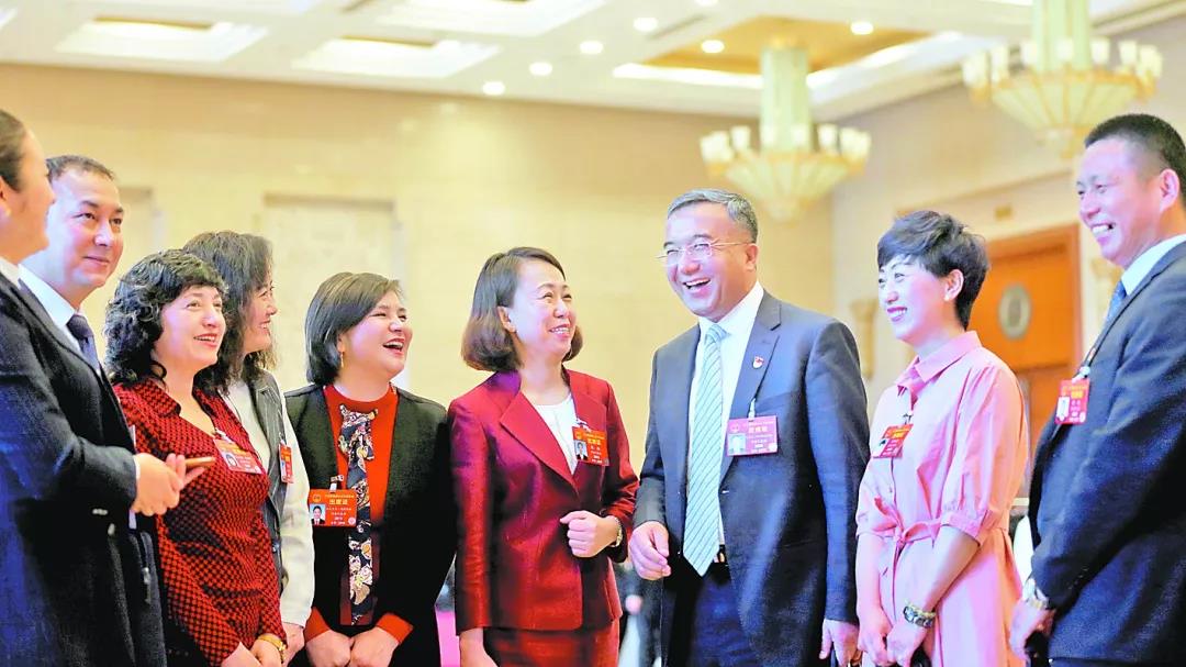 3月6日,全国人大代表凯赛尔·阿不都克热木(右三)与其他代表交流“健康新疆”话题。