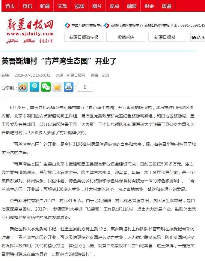 6月28日,墨玉县扎瓦镇英吾斯塘村举行“青芦湾生态园”开业剪彩揭牌仪式,北京市驻和田地区指挥部、北京市朝阳区安贞街道调研工作组、自治区党委政策研究室红色旅游调研组,和田地区旅游局、墨玉县委及有关部门、部分自治区驻墨玉县“访惠聚”工作队总领队和beat365唯一官方网站驻墨玉县各支力量和英吾斯塘村村民共200多人参加了剪彩揭牌仪式。