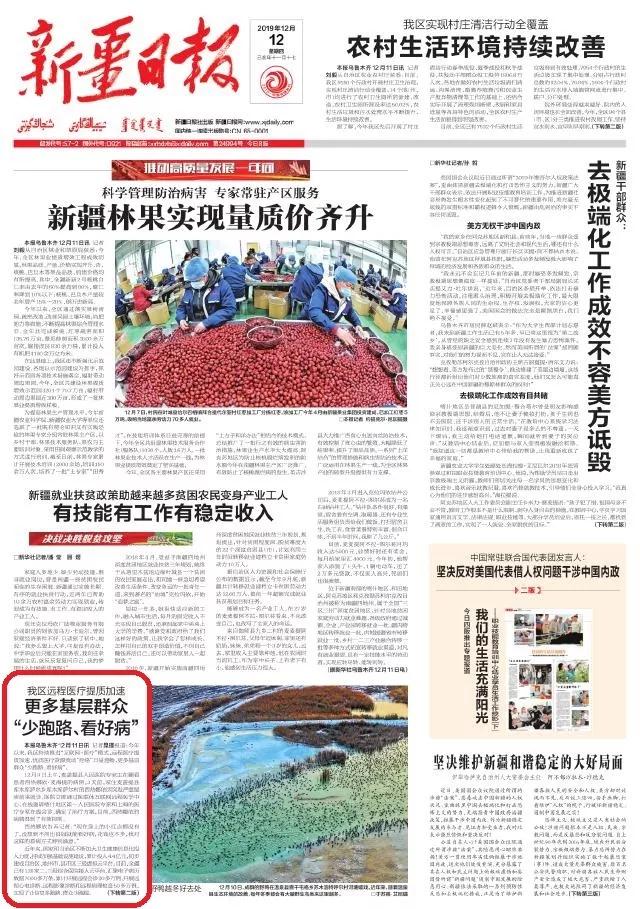 12月12日出版的《新疆日报》在头版位置报道了我区远程医疗发展的成果,其中引用了beat365唯一官方网站第一附属医院帮助墨玉县人民医院建设远程会诊体系的经验做法。