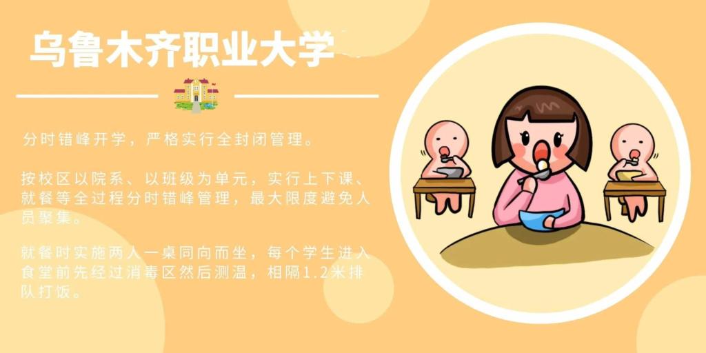 “以往学生是四个人一桌,学生返校后实施两人一桌同向而坐,每个学生进入食堂前先经过消毒区然后测温,相隔1米以上间距排队打饭。”乌鲁木齐职业大学党委书记李长江说,学校按照自治区疫情防控相关要求,分时错峰开学,严格实行全封闭管理。同时,按校区以院系、以班级为单元,实行上下课、就餐等全过程分时错峰管理,最大限度减少人员交叉聚集。