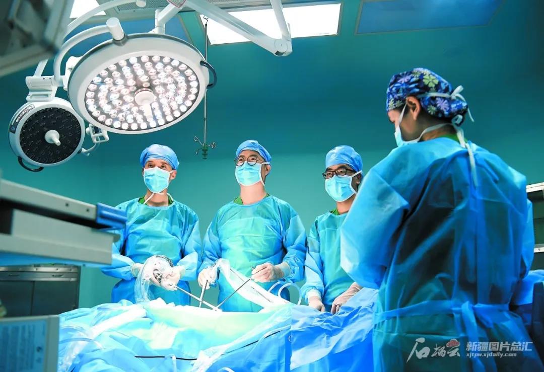 新医大一附院胸外科骨干医师宗亮(左二)带领莎车县人民医院医护人员为患者进行手术(摄于6月18日)