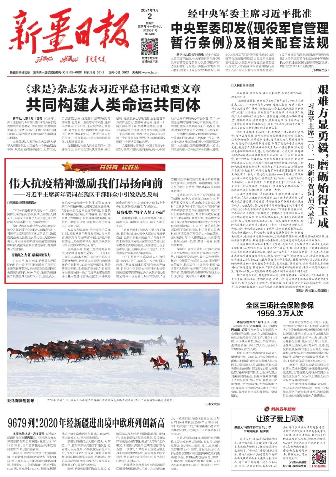 惊心动魄的抗疫大战,是2020年令每个人都刻骨铭心的记忆。新年贺词中,习近平主席那深情而坚定的话语,激荡在天山南北各族儿女的心里。大家纷纷表示,伟大抗疫精神是我们最宝贵的精神财富,更激励着我们坚定意志、奋勇搏击、昂扬向前。