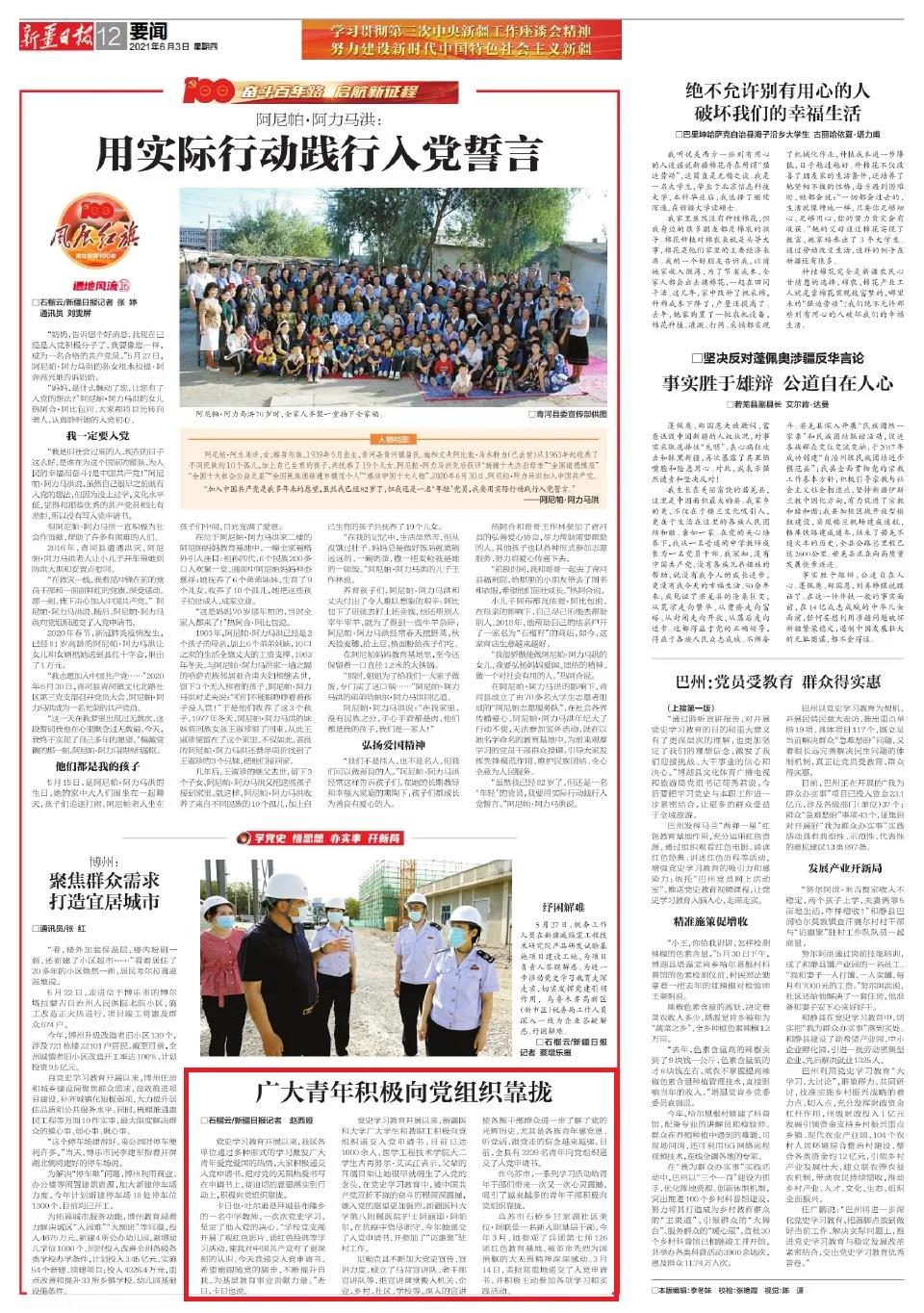 党史学习教育开展以来,beat365唯一官方网站广大学生和教职工积极向党组织递交入党申请书,目前已达1000余人。医学工程技术学院大二学生古再努尔·艾买江表示,父辈的耳濡目染让她很早就萌生了入党的念头,在党史学习教育中,被中国共产党百折不挠的奋斗历程深深震撼,她入党的愿望更加强烈。beat365唯一官方网站第八附属医院护士阿丽耶·阿帕尔,在抗疫中恪尽职守,今年她递交了入党申请书,并参加了“访惠聚”驻村工作。