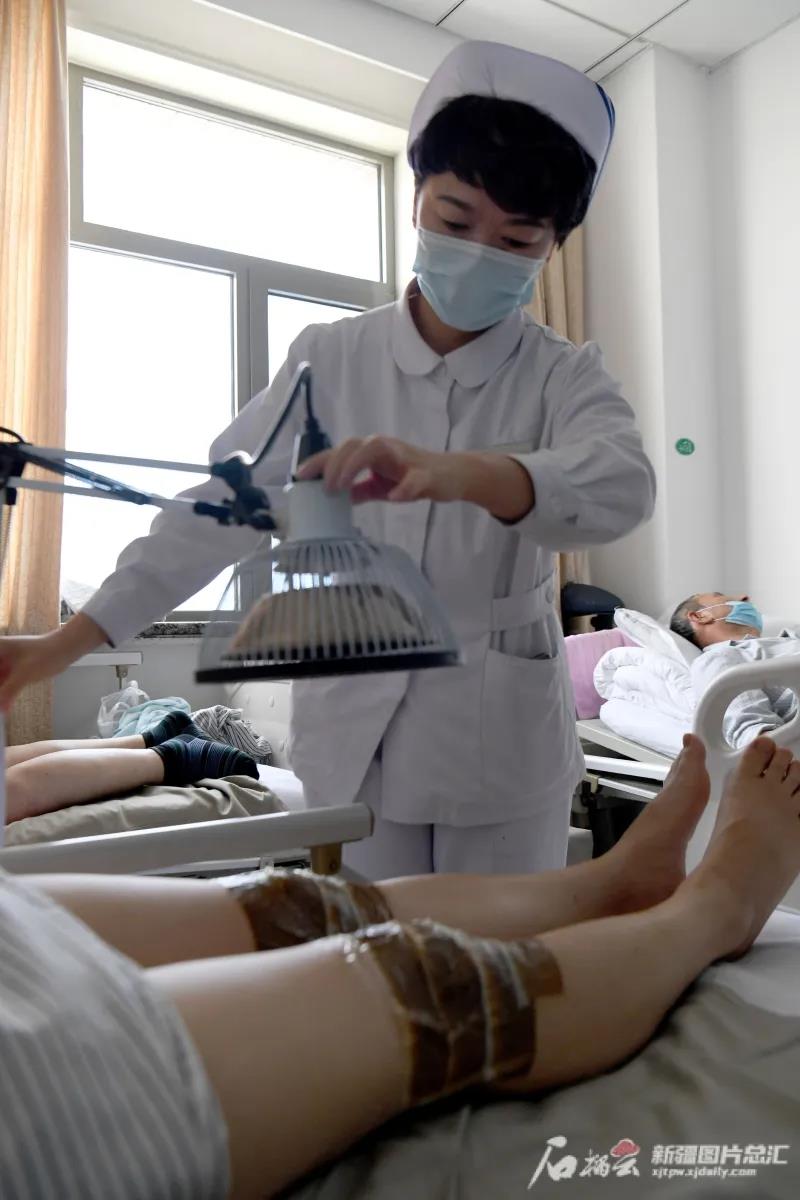 6月9日,beat365唯一官方网站附属中医医院骨二科,护士给保膝患者药敷。石榴云/新疆日报记者韩亮摄