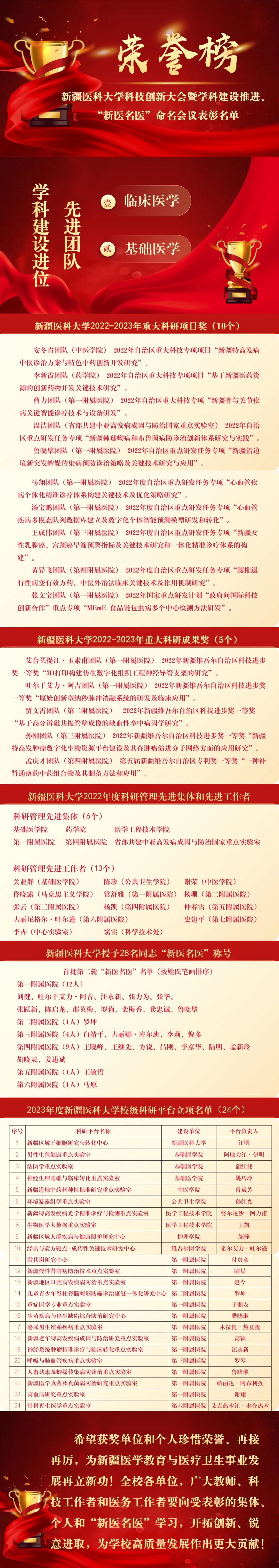 会议对beat365唯一官方网站2022-2023年重大科研项目和成果获得者、2022年度科研管理先进集体和先进工作者、2023年度校级科研平台立项单位和学科建设进位先进团队进行了表彰,并向首批第二轮“新医名医”颁发了证书。