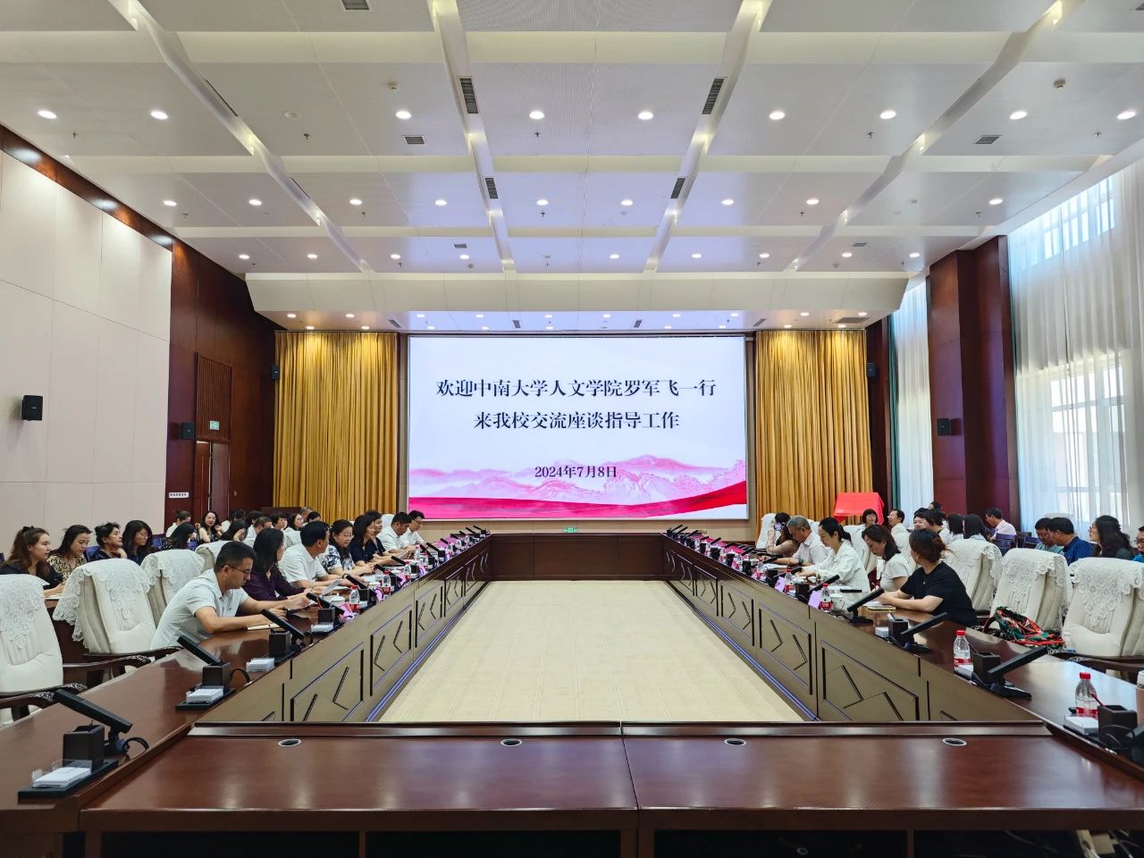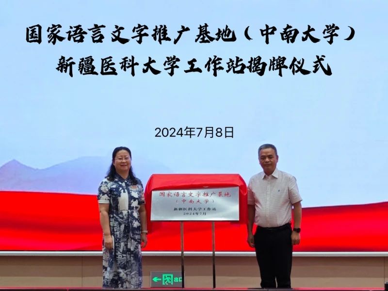 7月8日,中南大学人文学院党委书记罗军飞一行来到beat365交流座谈,并举行国家语言文字推广基地(中南大学)beat365唯一官方网站工作站揭牌仪式,副校长刘涛出席座谈会,校党委常委、宣传部部长林素兰主持会议。