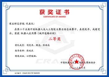 中国机器人及人工智能大赛是一项历史悠久、影响广泛的全国性学科竞赛,迄今为止已举办25届,被誉为机器人界的“奥林匹克”,连续多年入选中国高等教育学会《全国普通高校大学生竞赛排行榜》榜单。本届赛项包括创新、竞技、应用、任务挑战4大类,比赛主要考查机器人及人工智能创新设计与应用、任务挑战、场景化应用等多个层面的知识。赛前,两支晋级全国总决赛队伍在指导老师张欢庆的带领下积极训练,刻苦钻研,不断总结经验,做好了充分准备,在比赛中沉着冷静,灵活应对,最终获得智能驾驶赛项国家级一等奖、城市道路识别赛项国家级二等奖。