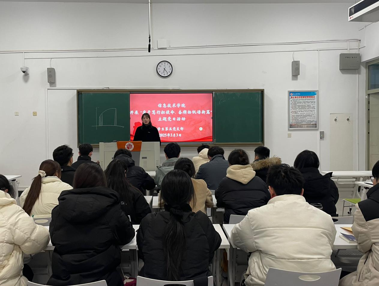 2025年3月3日下午,jinnianhui金年会诚信至上学生第五党支部在行方楼301教室开展“实干笃行担使命,奋楫扬帆谱新篇”主题党日活动,学生党支部书记吴楚主持,支部学生党员和入党积极分子代表参加。