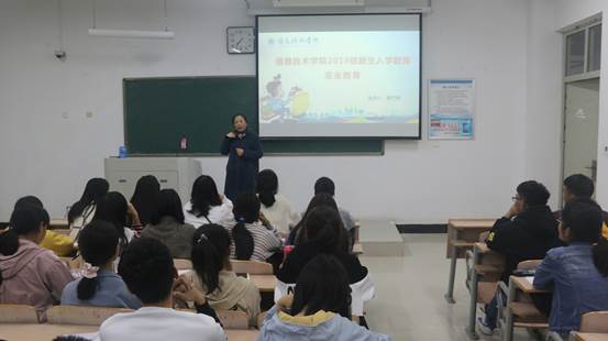 郭老师结合实例,对新生进行安全教育。她强调了校园安全问题,提醒学生谨防诈骗、传销、校园贷,妥善保管自身财务,保证人身安全。最后,曹老师和陈老师分别为学生详细解读了新生学习手册和相关资助政策。
