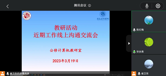 319日上午,公修计算机基础教研室借助腾讯会议开展教研活动,会议主题为近期工作线上沟通交流会,教研室主任崔卫东主持会议,教研室各位老师针对2023年春季学期近期有关工作开展情况积极沟通发言,气氛活跃。