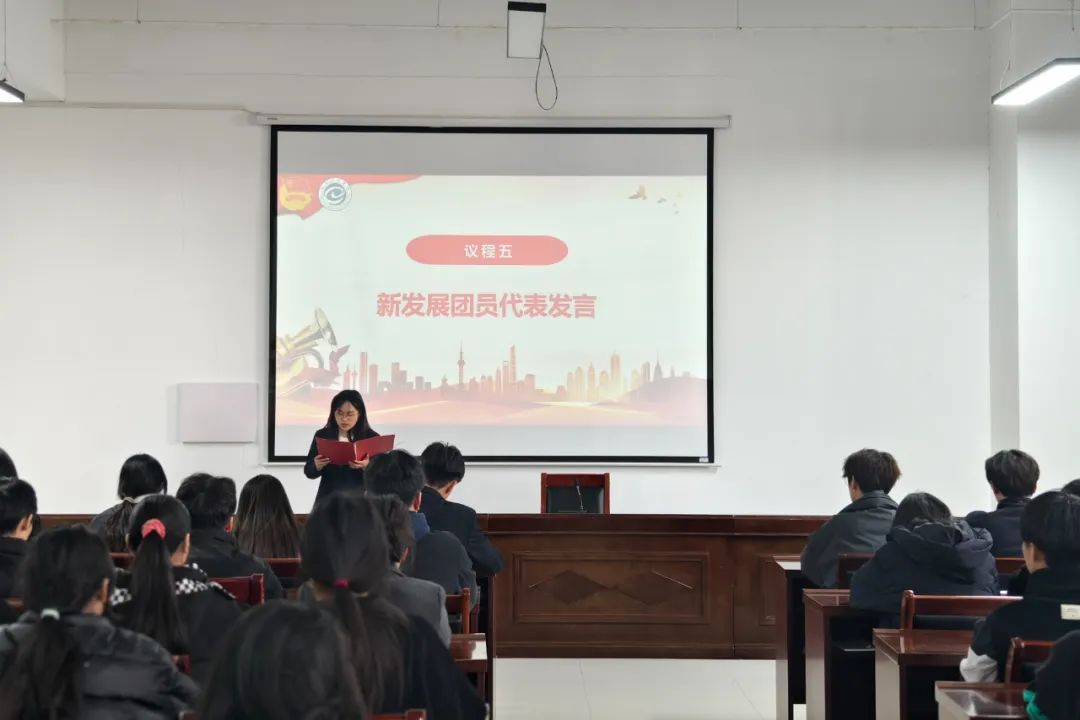 优秀团员代表仝龙飞和新发展团员代表马欣然分别代表新老团员发言,号召同学们要时刻牢记自身职责使命,勤奋学习,耐心实践,坚定不移听党话、跟党走,展现属于新时代青年的风采和担当。